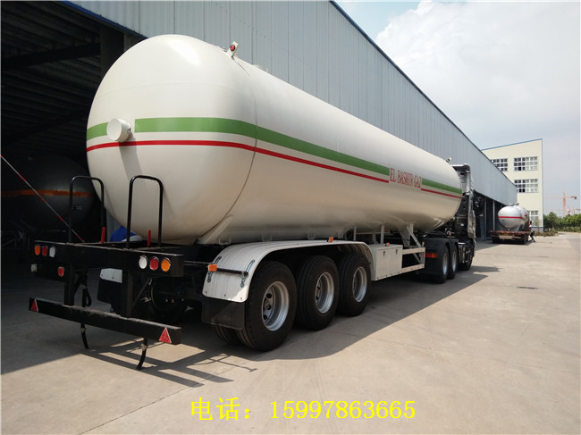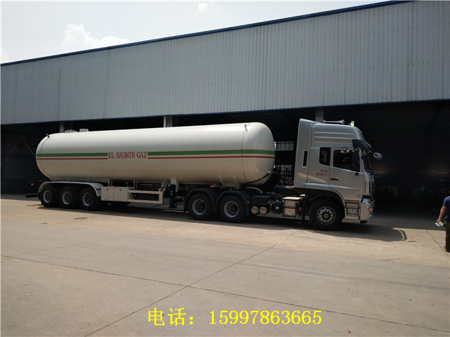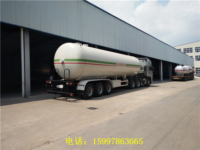 54立方LPG半掛車按照GB150-2011《壓力容器》設計制造,采用應力分析方法設計,使用Q345R材質制作,罐體上設計有液位計、安全閥、溫度計、壓力表等安全附件,罐體內部還設有防浪板。