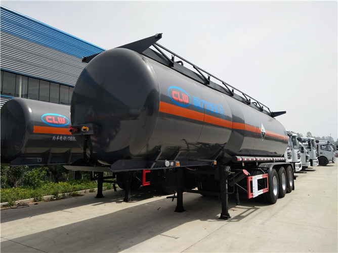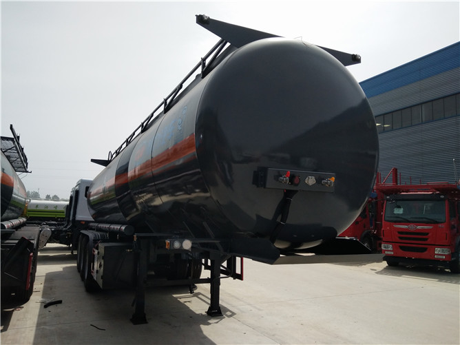28.2立方稀硫酸半掛車采用Q235板材制作,筒體厚度4.2mm,封頭厚度4.75mm,襯塑16mm,兩個進料口,后尾部左右自流配3寸PP球閥,鋁合金附件,一個工具箱,一個備胎架,1200真空胎(鋁合金鋼圈)。