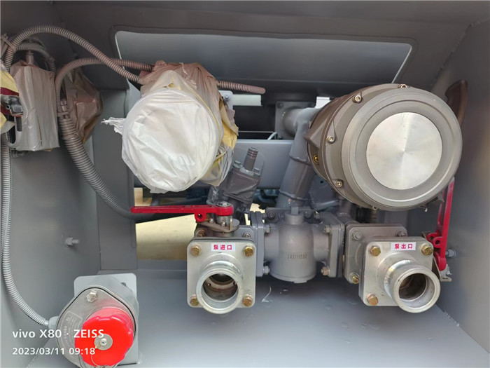 它的容積為1.9立方,采用Q235優(yōu)質(zhì)碳鋼板材,標(biāo)配大流量油泵(可泵進泵出),標(biāo)配通倉帶歐標(biāo)全套下裝油系統(tǒng)(含1個下裝卸油閥、1個油氣回收閥、1個油氣回收接口、1套氣動組合開關(guān)、1個防溢流探桿和1個插座),一只歐標(biāo)罐蓋,一個海底閥,罐體頂部兩側(cè)帶折疊升降防護欄,標(biāo)配顏色灰色,罐體兩側(cè)正中貼3M-1級橙色反光帶,貼三個“易燃液體”標(biāo)識,安全告示牌,合適位置安裝一只工具箱。