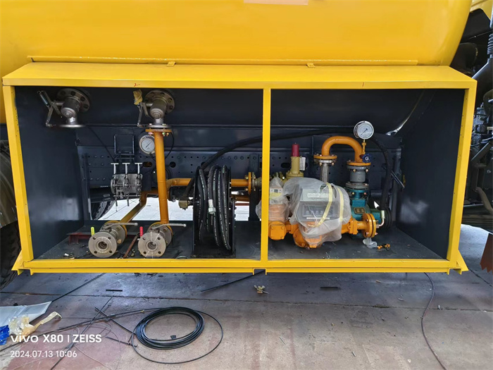 該車罐體采用Q345R材質(zhì)生產(chǎn),直徑為2100毫米,筒體厚度12毫米,封頭厚度為14毫米,配置泵、流量計、安全附件如溫度計、壓力表、安全閥、緊急切斷閥等必要設(shè)備。從圖片可以看出,液相和氣相球閥與流量計一起安裝在車輛的左側(cè),且高度適宜,方便客戶進(jìn)行裝卸作業(yè)。