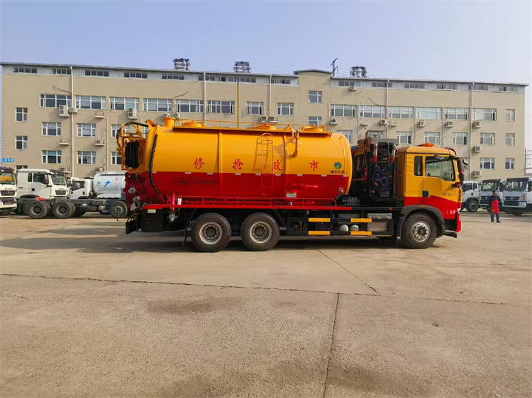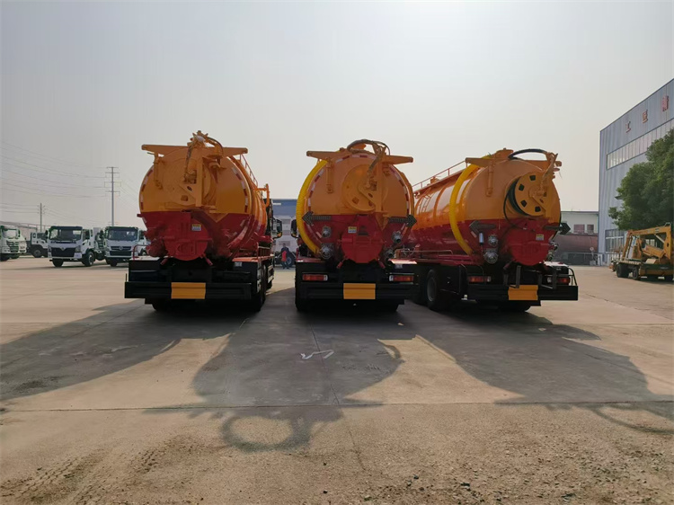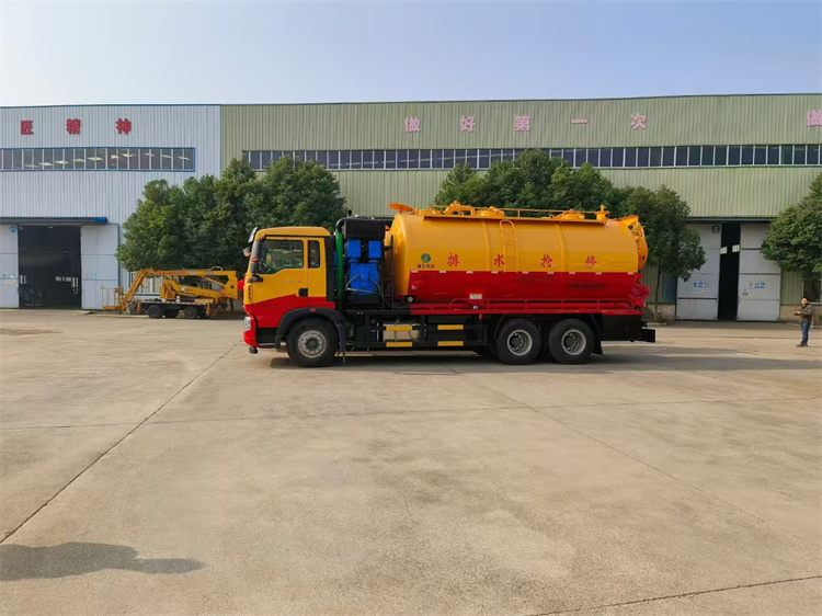 吸污罐配置:一個散水罐口,罐內爬梯,罐體內部防浪板加固,水循環(huán)泵水箱為碳鋼材質,副駕側排150鋁合金球閥,吸污罐尾部不開大蓋,開600小蓋排污口,尾部600小蓋左側一個150排污口,右側一個100的進料口,一個100鋁合金排污口,側邊一個100排清水,罐體尾部兩側工具箱,1根10米吸污管,箭頭燈,手動油門。