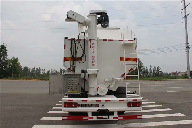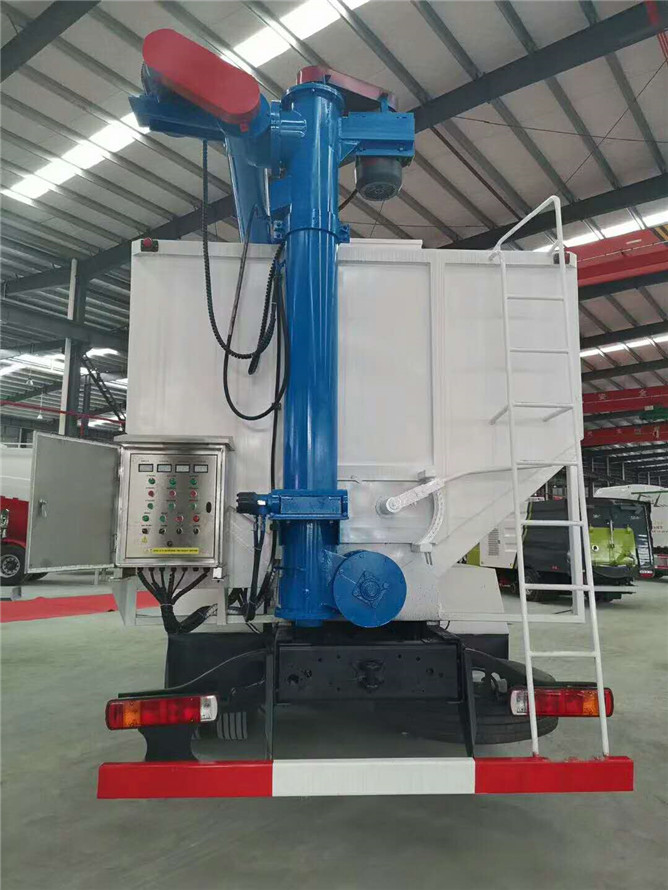 飼料車罐體材質(zhì)采用國標4mm厚優(yōu)質(zhì)碳鋼板制作,整車3條絞龍,由3個5.5KW電機帶動,頂部絞龍用液壓控制舉升,可左右旋轉(zhuǎn)180°。罐體分4倉,可根據(jù)用戶要求做多個獨立分倉,可以獨立控制各分倉卸料順序和速度。