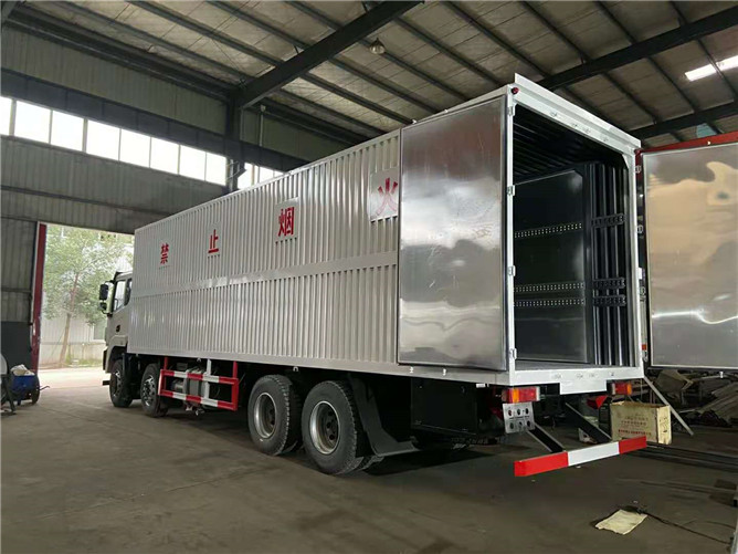 此輛危險品廂式運輸車搭載300馬力發(fā)動機(jī),動力強(qiáng)勁,專業(yè)運輸3類易燃液體危險品,如粘合劑,涂料,料溶液,煤油,機(jī)油,苯,甲醇,乙醇,丙酮,甲苯,二甲苯、油漆及稀釋劑等。