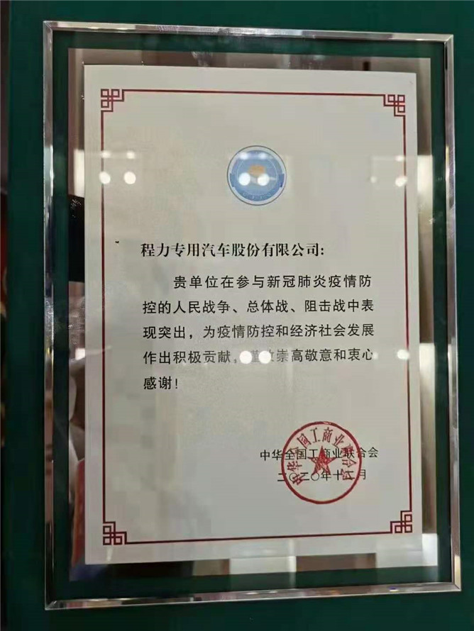 當(dāng)前的位置>>首頁(yè)>>>> 程力專(zhuān)用汽車(chē)公司榮獲全國(guó)100家抗疫先進(jìn)民營(yíng)企業(yè)